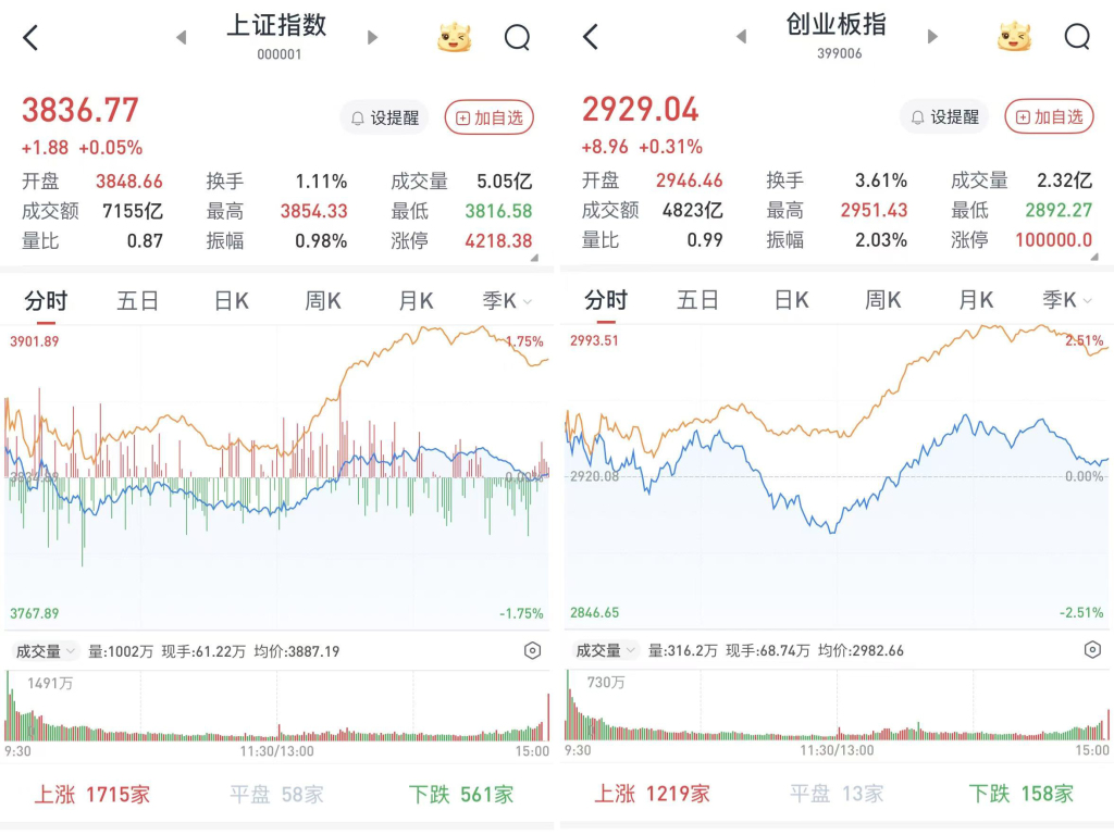 至收盘,上证综指涨0.05%,报3836.77点;科创50指数涨0.84%,报1296.6点;深证成指涨0.37%,报12585.08点;创业板指涨0.31%,报2929.04点。