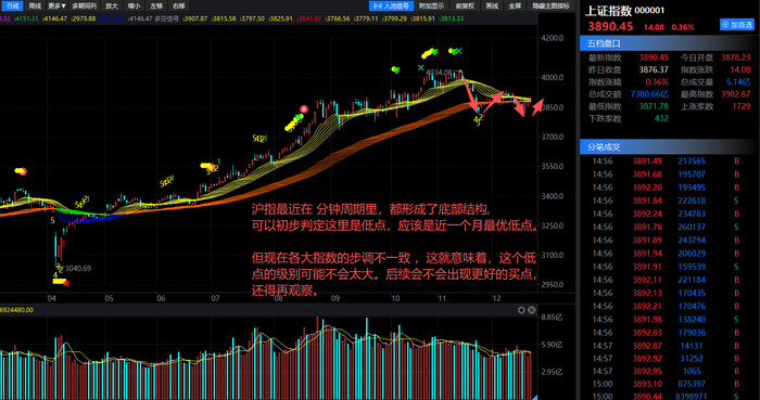 沪指最近在60分钟、90分钟、120分钟周期里,都出现了底部钝化并形成了底部结构,可以初步判定这里是低点。从走势上看,沪指近期是很明显的ABC调整浪,而且指数已经跌到3815点的新低。单看沪指的话,这应该是近一个月最优低点了。但问题在于,现在各大指数的步调不一致,其他指数却没有跟上,没法得出和沪指一样的“低点”结论。这就意味着,这个低点的级别不会太大。后续会不会出现更好的买点,还得再观察。当然,未来的走势充满不确定性;我们之前也说过,大方向上这只是上升途中的一次调整,所以没必要过分追求“买在最低点”的完美操作。对交易来说,最关键的就是抓住自己能确定的机会,放弃那些把握不准的部分。